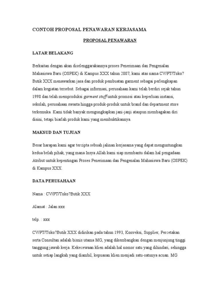 contoh proposal kerja sama merupakan informasi berguna bagi pemilik usaha atau bisnis untuk mendapatkan modal tambahan dalam rangka mengembangkan usaha tersebut. Setelah berbagai penjelasan di atas dipelajari, berikut terdapat banyak sekali contoh surat penawaran mulai dari surat penawaran produk atau jasa, adapula surat penawaran kerja. Demikian surat penawaran jasa pelayanan hukum ini kami sampaikan, besar harapan kami agar bapak/ ibu memberikan kesempatan kami untuk dapat bertatap muka secara langsung untuk memperkenalkan kantor adokat kami, dan kami sangat menunggu kabar baik dari bapak/ ibu. Pembangunan jalan, jalur kereta api, proyek. proposal penawaran proposal usaha rifa printing (percetakan offset & Disamping memiliki pengaruh yang baik untuk membuat jenis usaha kita dapat laris dan laku dipasaran. Penutup berisi penegasan atau kesimpulan proposal yang disertai dengan ucapan terima kasih untuk para calon donatur dan sponsorship. contoh email penawaran produk asuransi materi pelajaran 4. Doc proposal penawaran produk yenny oktafitriana arbi format 499 x 709 pixel. 6 contoh surat penawaran proposal kerjasama. Cara mendapatkan media partner yang tepat untuk diajak kerja. Adapun proposal perancangan website yang kami tawarkan, telah dilampirkan bersamaan dengan surat ini. Background each student is trying to make ends meet while in the university, including eating and drinking, that implies a length of time shopping because many students are spending, because the service is still conventional.
